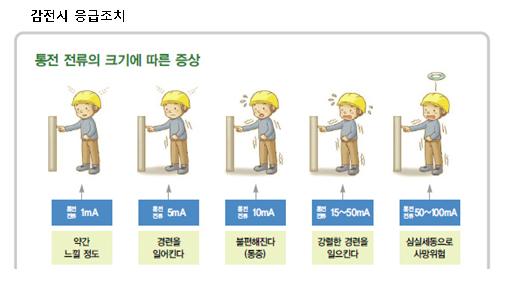 - 전원을 차단하거나, 전기가 통하지 않는 물질(플라스틱, 나무 등)로 재해자와 전기위험과
