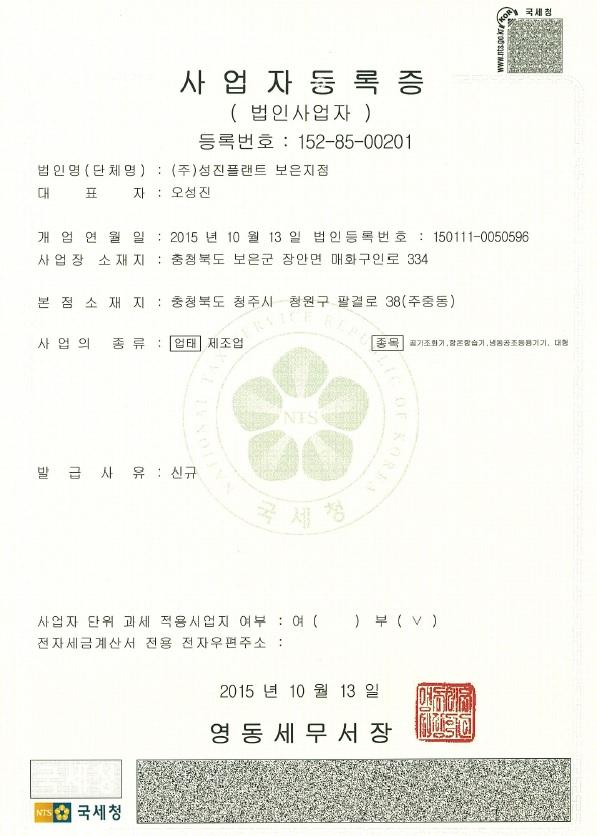 [공지] (주)성진플랜트 보은지점 등록